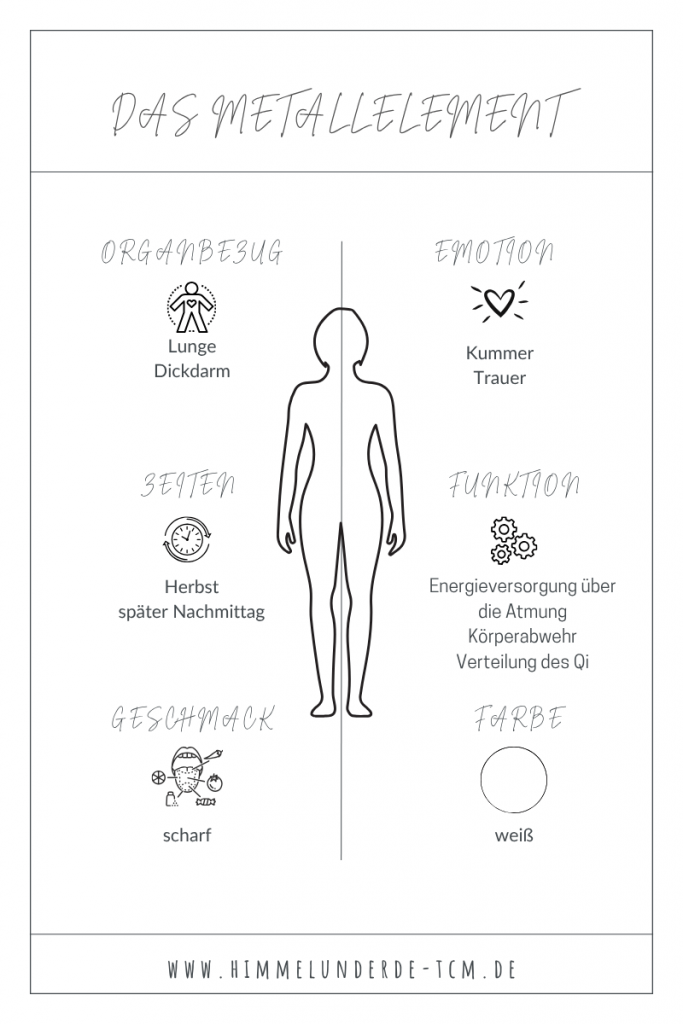 In der Herbstzeit ist unser System einfach sehr gefordert. Die zunehmende Kälte und Wind von außen erfordern eine starke Körperabwehr. Diese wird in der TCM dem Metallelement zugeordnet, dem sogenannten Wei-Qi. Ist das Metallelement geschwächt, z.B. durch Trauerprozesse, ist der Körper anfälliger für Infektionen, insbesondere der Atemwege. Diese schwächen dann energetisch vor allem die Lunge, die neben dem Dickdarm energetisch dem Metallelement zugeordnet wird. Eine geschwächte Lungenenergie lässt uns wiederum stärker unsere Trauer fühlen und so weiter.
